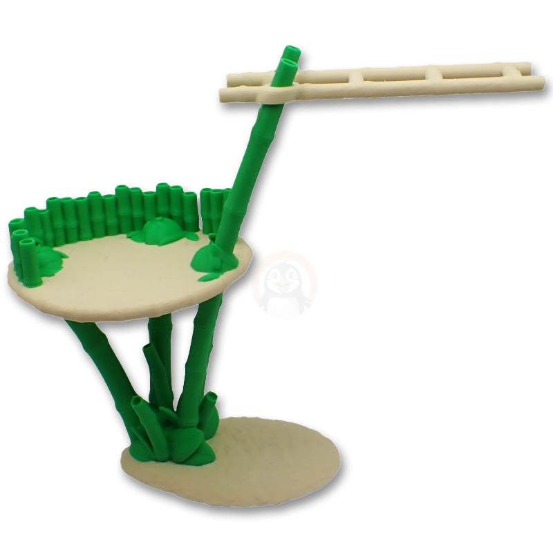 Bambusový stojan je vyroben s láskou pomocí nejmodernější technologie 3D tisku, což zaručuje, že každý detail je perfektní. Ve spodním patře najdete útulné sezení, obklopené krásnými bambusovými prouty, kde si vaše panda může odpočinout po dlouhém dni plném pandích radovánek. A když je čas na trochu akce? Žebřík na druhém patře je ideální pro lezení, visení a všechny ty pandí kousky, které tak milujete!