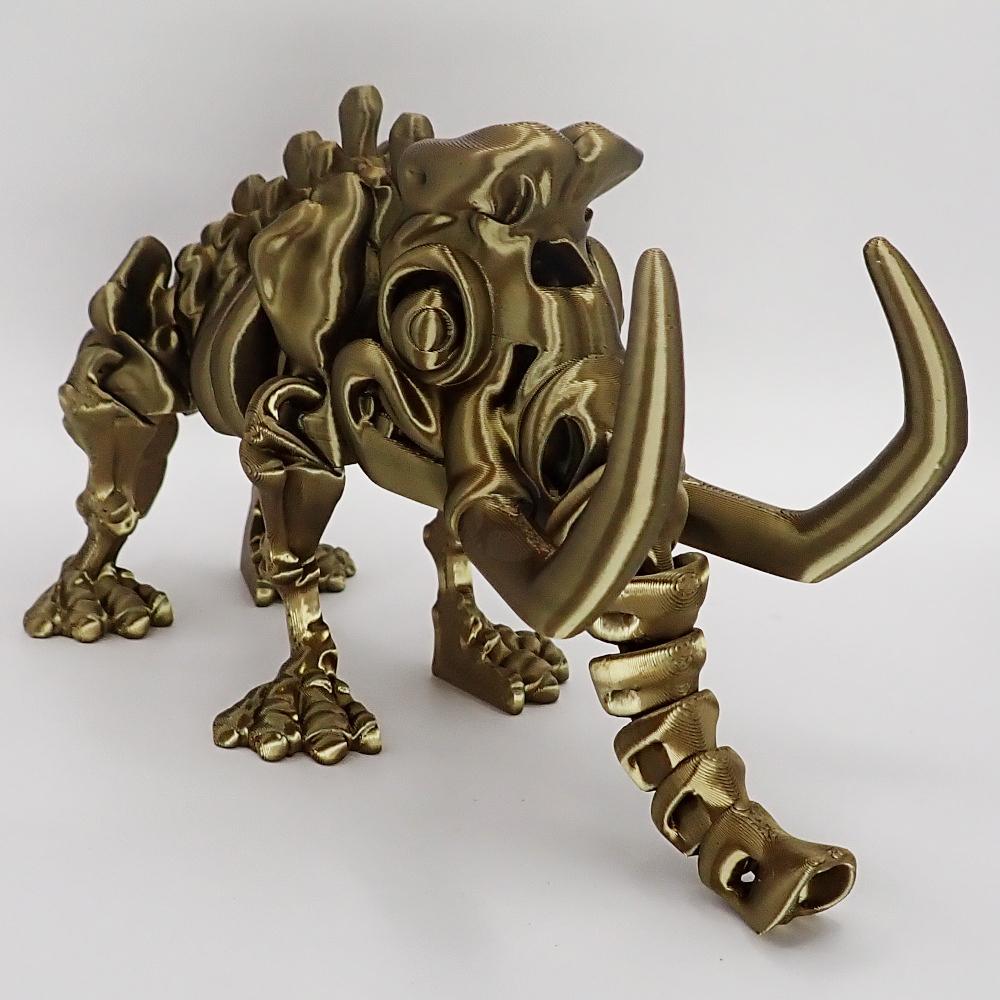 S přátelským výrazem, který vypadá, jako by se usmíval, a čtyřmi zadními zuby, které vykukují, je tato kostra mamuta dokonalým způsobem, jak oživit váš pracovní stůl nebo pokoj. A to není všechno! Díky pokročilé technologii 3D tisku jsme mu mohli propůjčit ohebné nohy, hlavu, ocas a samozřejmě chobot a oči. Ano, čtete správně – chobot a oči! A nezapomeňte na ty dva impozantní kly, které dodají mamutovi opravdový šmrnc!
