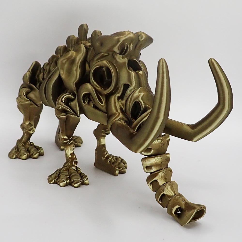 S přátelským výrazem, který vypadá, jako by se usmíval, a čtyřmi zadními zuby, které vykukují, je tato kostra mamuta dokonalým způsobem, jak oživit váš pracovní stůl nebo pokoj. A to není všechno! Díky pokročilé technologii 3D tisku jsme mu mohli propůjčit ohebné nohy, hlavu, ocas a samozřejmě chobot. Ano, čtete správně – chobot! A nezapomeňte na ty dva impozantní kly, které dodají mamutovi opravdový šmrnc!