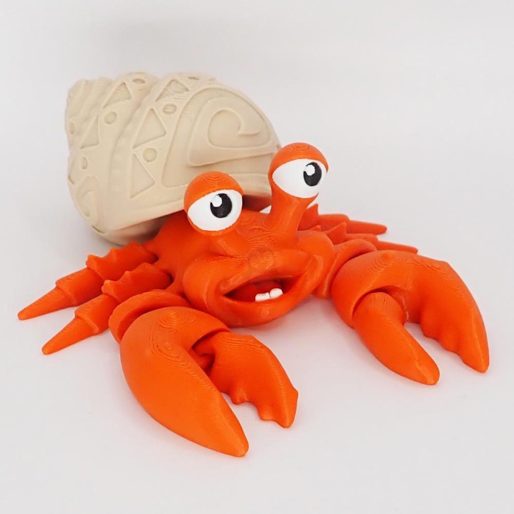 Tady pozor! Přichází krab poustevníček, který rozhodně není žádný suchar! Má dvě pohyblivá klepeta, se kterými rád rozhazuje, jako by pořád něco komentoval. Jeho otevřená pusinka a vykukující zoubky napovídají, že je to pořádný šprýmař – možná zrovna plánuje mořskou honičku po pláži nebo šílený taneček v písku.