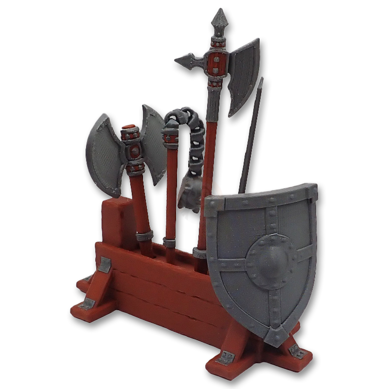 Při výběru vícebarevné varianty Stojanu budou zbraně také vícebarevné. Je však možné si zvolit odlišnou barvu zbraní než je vícebarevná (například jednobarevné, svíticí nebo přechodové barvy). V tomto případě napište své přání v košíku do poznámky pod objednanou postavičkou (např. ve formátu "FLFA 074 Rytířská výbava - černočervené zbraně").