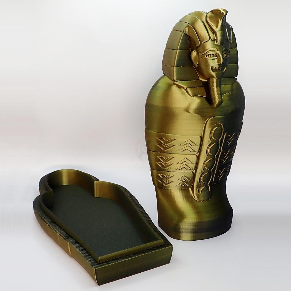Chcete dát své mumií opravdu luxusní domov? Tento sarkofág je přesně to, co potřebujete! Není to jen obyčejná krabice na spaní, tohle je královská pohovka pro vaši oblíbenou mumii. Vyrobený s detailním vyobrazením faraona, který si užívá slunečné paprsky (nebo aspoň to vypadá), tento sarkofág přináší do vaší sbírky nejen mystiku, ale i špetku faraonského luxusu.