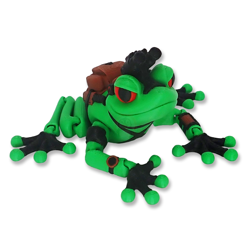 Ticho, právě přichází… Agent Žabák! Ne obyčejná žába z rybníku – tenhle zelený frajer je vycvičený mistr převleků, hádanek i skákání do dálky! Na hlavě má dalekohled pro sledování podezřelých šneků, v uších poslouchá přes špionážní sluchátka a na zádech si nosí batoh plný přísně tajných věcí (nebo svačinu, to záleží na misi). Rukavice? Samozřejmě – nikdy nevíte, kdy budete muset šplhat po leknínu. A nůž za pasem? Čistě pro případ, že bude potřeba ukrojit si dort na tajné oslavě!