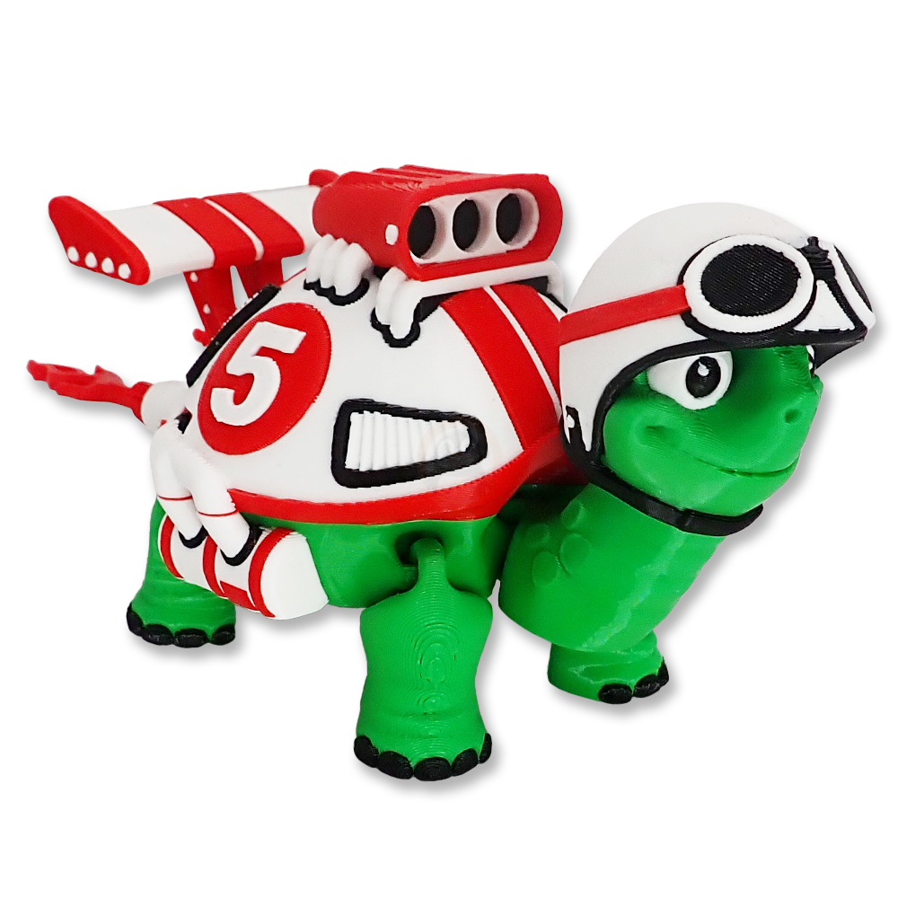 Zapomeňte na pomalé želvy! Tenhle želvák je závodník tělem, krunýřem i přilbou. Tahle závodní mašina v krunýři má přilbu na hlavě, motor na zádech, výfuk, co syčí jako had v běhu, a zadní křídlo, které by mu záviděl i nejrychlejší sporťák! No vážně – tahle želva by klidně mohla vyzvat i zajíce na odvetu… a tentokrát by to dopadlo určitě jinak!